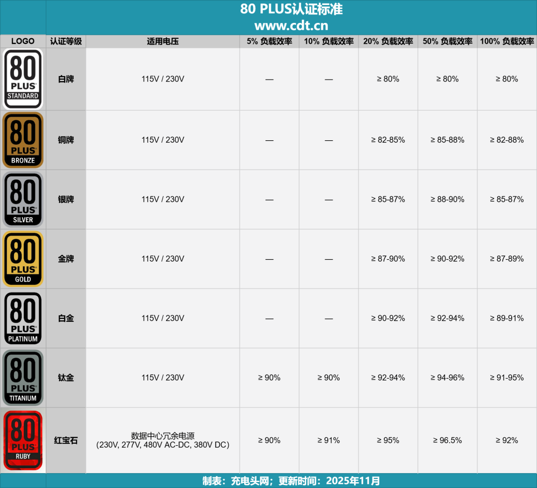 Ruby紅寶石認證是80PLUS 體系中面向數(shù)據(jù)中心的新高等級標準,于2025年提出,主要針對230V、277V、480V交流以及380V直流輸入的機架式冗余電源。在5%~100%全負載范圍內(nèi),它對效率和功率因數(shù)設定了明顯高于傳統(tǒng)白金、鈦金的門檻,例如在20%與50%負載點要求接近95%~96.5%的轉(zhuǎn)換效率,并在20%以上負載階段要求更高的功率因數(shù)。通過Ruby認證的電源,能夠在高密度機房場景中進一步壓縮能耗損失,為數(shù)據(jù)中心整體能效優(yōu)化提供更大的空間。