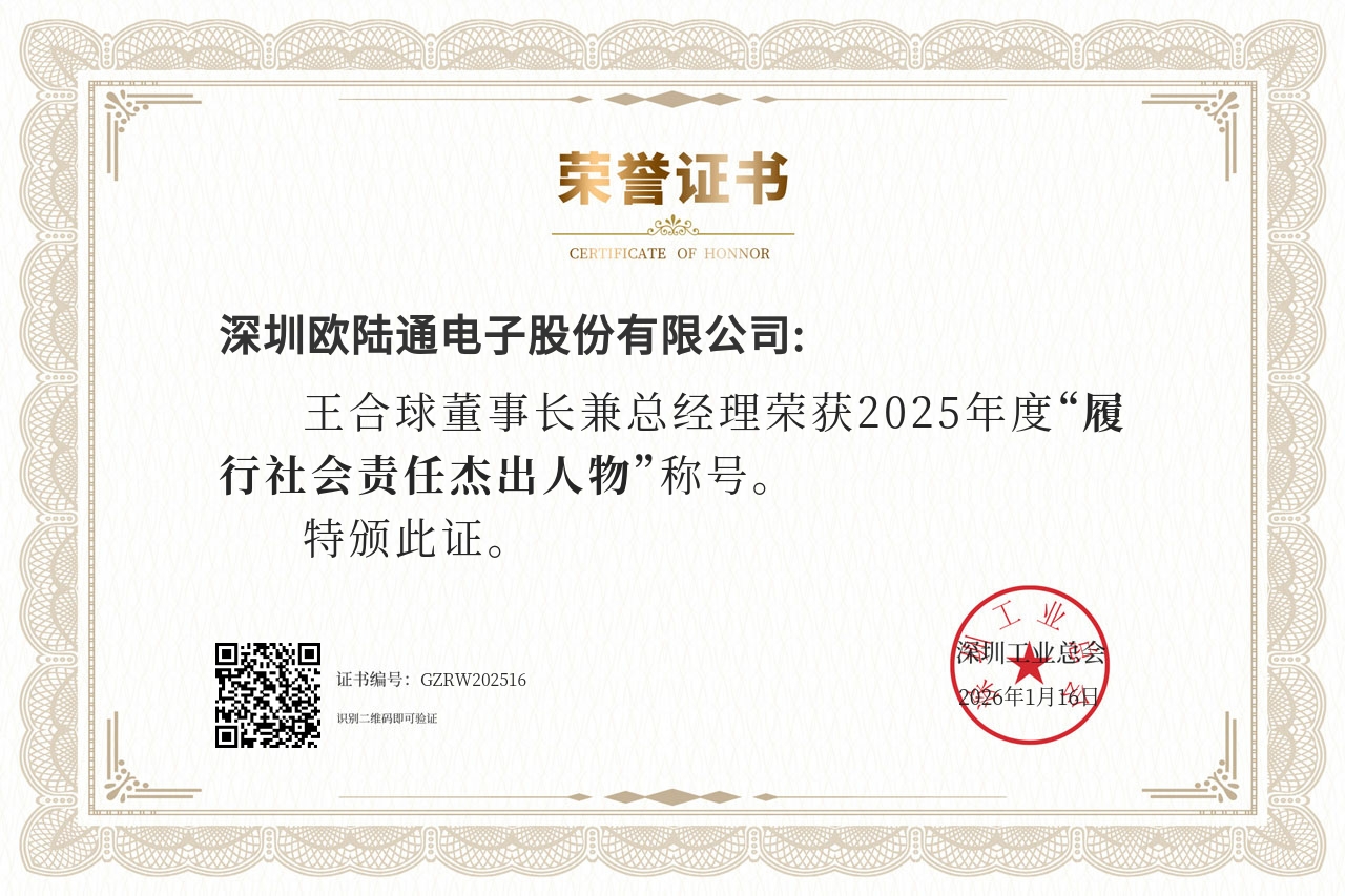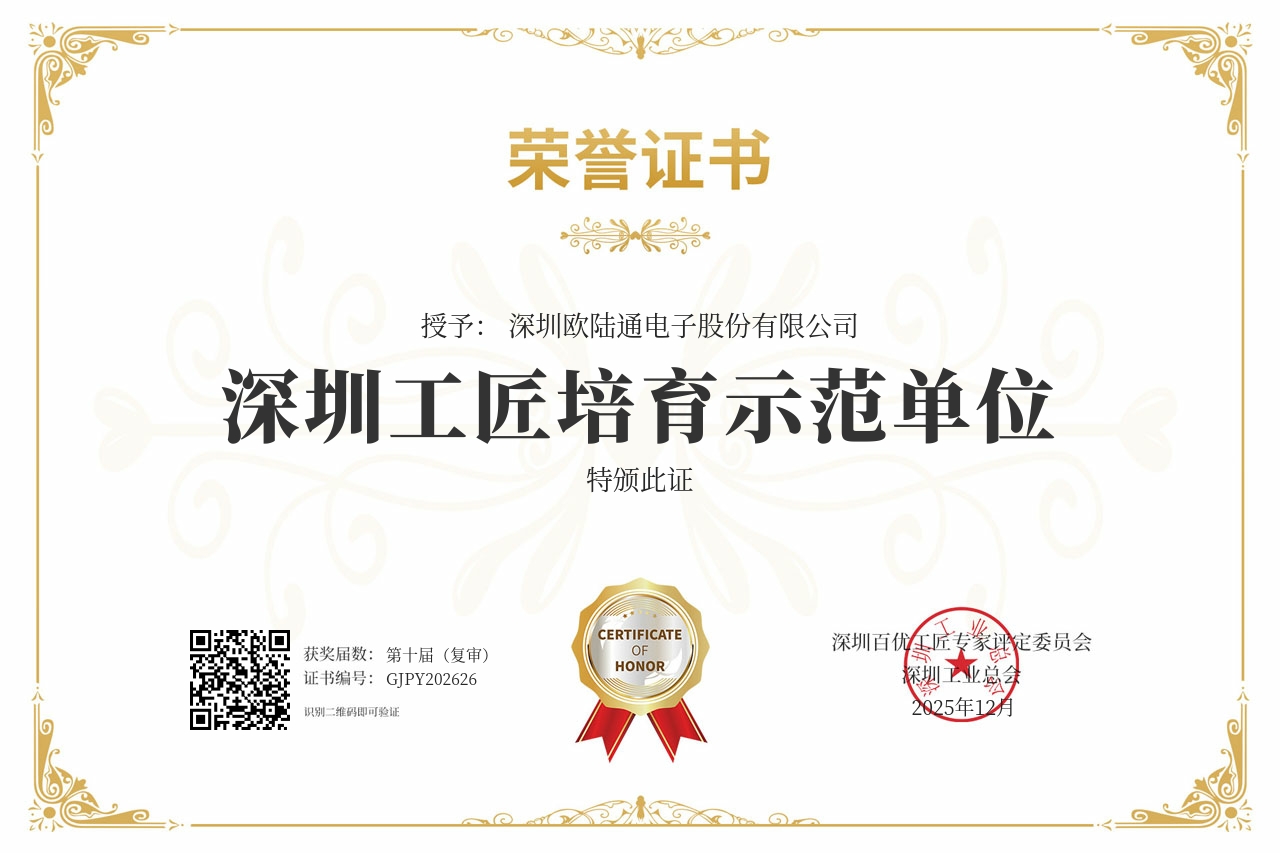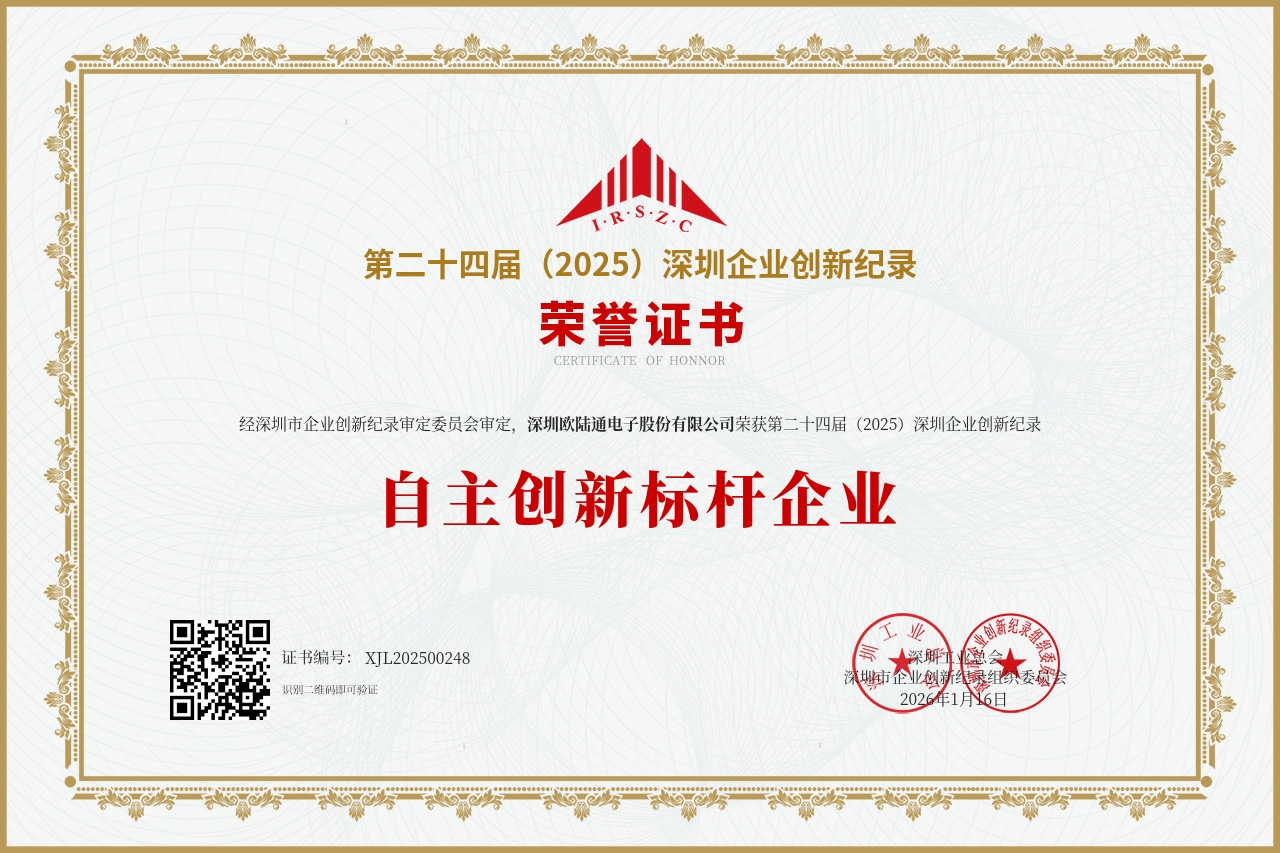 憑借在技術(shù)創(chuàng)新、區(qū)域產(chǎn)業(yè)引領(lǐng)、社會責(zé)任踐行等維度的綜合表現(xiàn),歐陸通一舉斬獲九項(xiàng)大獎。歐陸通入選“2025粵港澳大灣區(qū)企業(yè)創(chuàng)新力榜單-創(chuàng)新成就榜”,榮獲“深圳工匠培育示范單位”、“2025年度履行社會責(zé)任杰出企業(yè)”、“第二十四屆深圳企業(yè)創(chuàng)新紀(jì)錄-自主創(chuàng)新標(biāo)桿企業(yè)”獎以及兩項(xiàng)“第二十四屆深圳企業(yè)創(chuàng)新(中國)紀(jì)錄”;歐陸通董事長兼總經(jīng)理王合球先生,榮獲“2025年度履行社會責(zé)任杰出人物”;歐陸通副董事長王越天先生,入選“2025粵港澳大灣區(qū)企業(yè)創(chuàng)新力榜單-創(chuàng)新杰出人物榜”,榮獲“第二十四屆深圳企業(yè)創(chuàng)新紀(jì)錄-創(chuàng)新突出貢獻(xiàn)人物”。