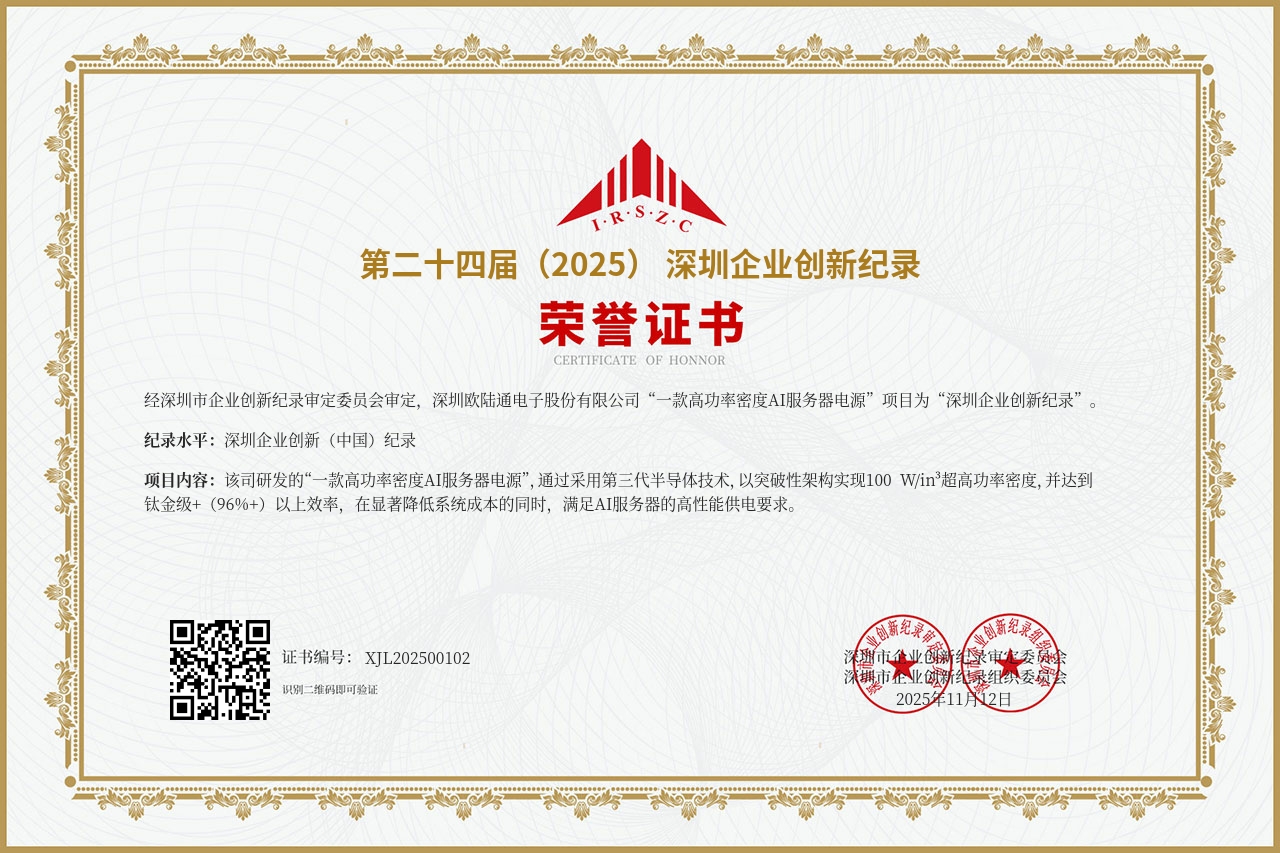 其中,歐陸通申報(bào)的“一款高功率密度AI服務(wù)器電源”、“一款大功率PoE網(wǎng)絡(luò)通訊電源”兩個項(xiàng)目被審定為“第二十四屆深圳企業(yè)創(chuàng)新(中國)紀(jì)錄”,并入選第二十四屆深圳企業(yè)創(chuàng)新紀(jì)錄“自主創(chuàng)新標(biāo)桿企業(yè)”。同時,公司副董事長王越天先生獲授“第二十四屆深圳創(chuàng)新紀(jì)錄——創(chuàng)新突出貢獻(xiàn)人物”。